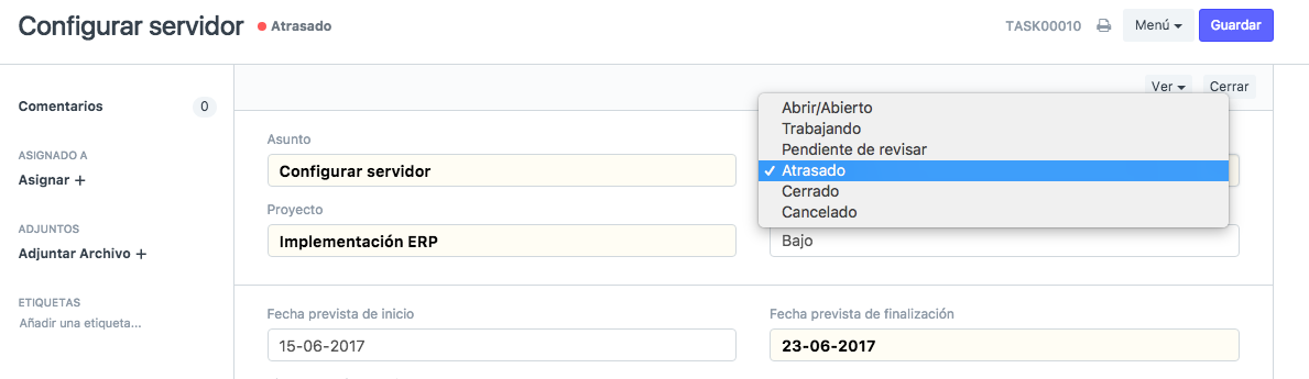 - Por defecto cada nueva tarea tiene el estado Abrir/Abierto asigado.