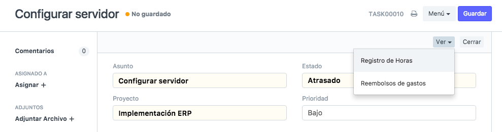 - Para ver los Registros de Horas pertenecientes a una tarea debe clickear en Ver > Registro de Horas.