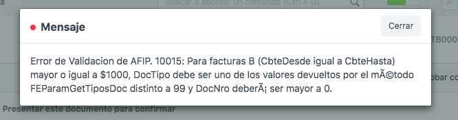 Error: 10015: Para facturas B (CbteDesde igual a CbteHasta) mayor o igual a $1000, DocTipo debe ser uno de los valores devueltos por el método FEParamGetTiposDoc distinto a 99 y DocNro deberá ser mayor a 0.