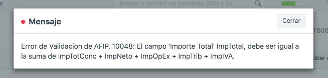 Error: 10048: El campo 'Importe Total' ImpTotal, debe ser igual a la suma de ImpTotConc + ImpNeto + ImpOpEx + ImpTrib + ImpIva.