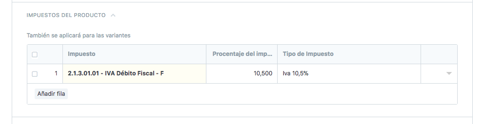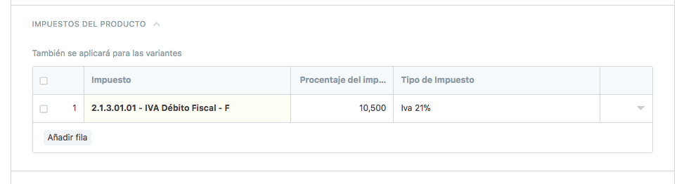 Motivo: Puede suceder que uno o varios de los productos a facturar tengan un IVA definido en los impuestos del producto distinto a 21% pero mal configurado. Como se puede ver en la imagen siguiente, el producto tiene IVA 10,5 configurado pero en el Tipo de impuesto se eligió 21%.