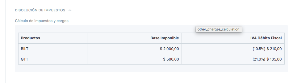 Si bien en la factura en la disolución de impuestos (imagen siguiente) se toma el valor correcto (10,5) y por ende calcula el importe neto y total correcto, internamente en el cálculo de datos a AFIP se toma lo ingresado en Tipo de Impuesto, es decir 21% produciendo el error.