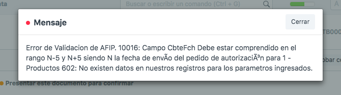 10016: Campo CbteFch Debe estar comprendido en el rango N-10 y N+10 siendo N la fecha de envío del pedido de autorización para 2 (Servicios) o 3 (Productos y Servicios). Error: 602: No existen datos en nuestros registros para los parametros ingresados.