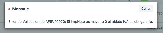 Error: 10070: Si ImpNeto es mayor a 0 el objeto IVA es obligatorio.