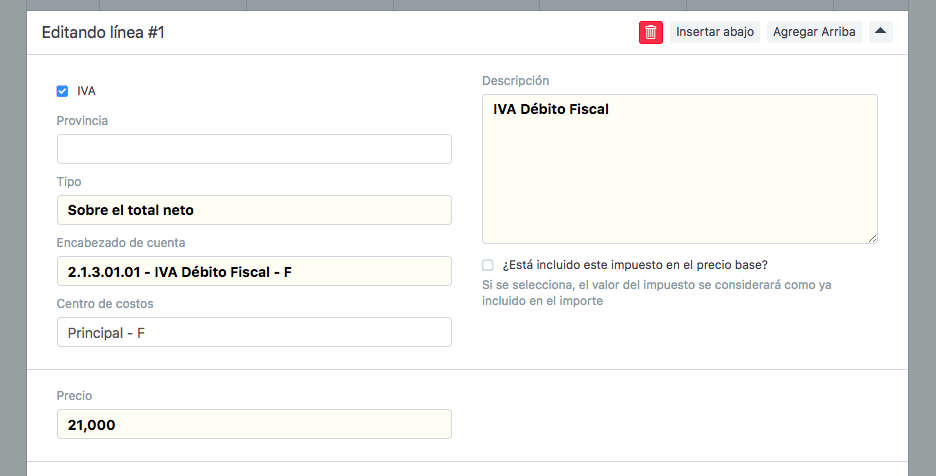 Solución: asegúrese de haber ingresado el impuesto de IVA y que este tenga activado el tilde IVA. Recuerde que puede configurar plantillas de Impuestos y definir una plantilla por defecto.