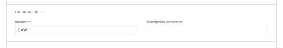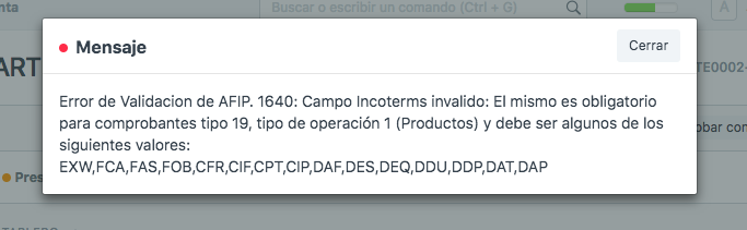 Error: 1640: Campo Incoterms invalido: El mismo es obligatorio para comprobantes tipo 19, tipo de operación 1 (Productos) y debe ser algunos de los siguientes valores: EXV,FCA,FAS,FOB,CFR,CIF,CPT,CIP,DAF,DES,DEQ,DDU,DDP,DAT,DAP.