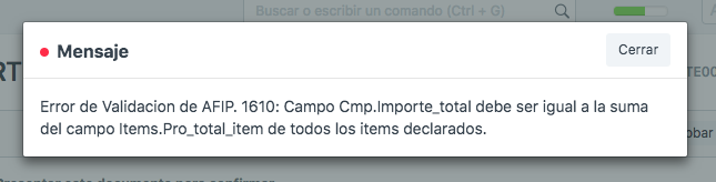 Error: 1610: Campo Cmp.Importe_total debe ser igual a la suma del campo Items.Pro_total_item de todos los items declarados.