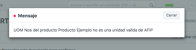 Error: UOM Nos del producto Producto Ejemplo no es una unidad valida de AFIP.