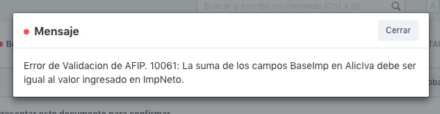 Error 10061: La suma de los campos BaseImp en AlicIva debe ser igual al valor ingresado en ImpNeto