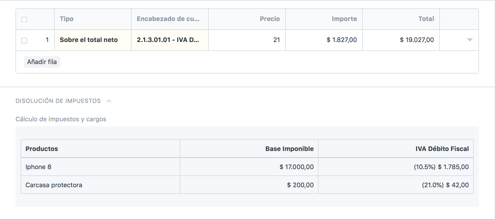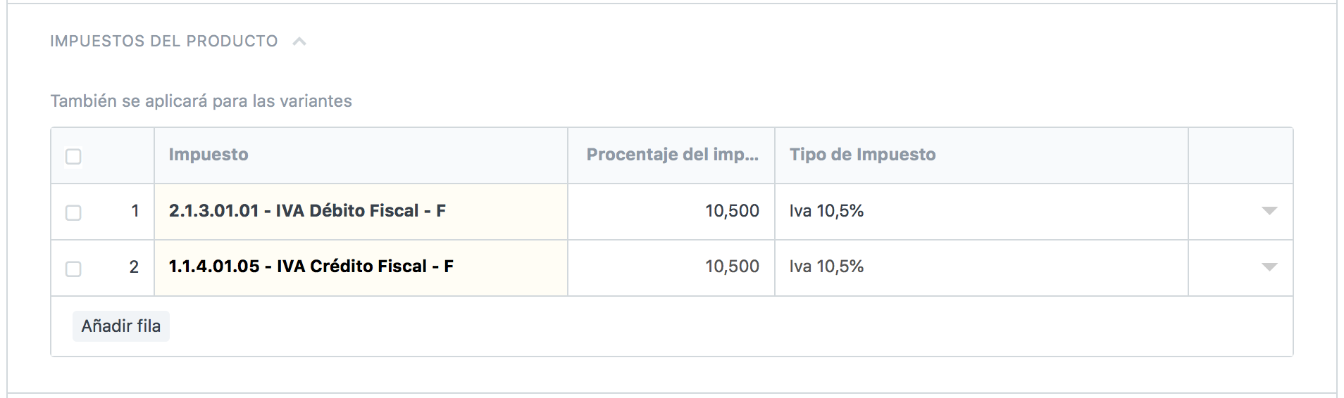 Agregamos una fila donde nos va a preguntar la cuenta del plan de cuentas(tiene que ser una cuenta subtipo IMPUESTO), y el porcentaje del producto.