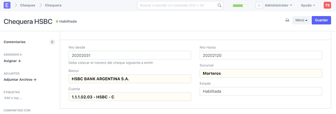 Nro Hasta: Es el último número de cheque de la chequera. Cuando se llegue a este número, la chequera se deshabilitará para que no se pueda utilizar por error.