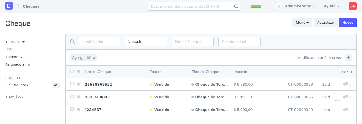 Cuando tengamos cheques de tercero que aún no hemos depositado y se pasen de la fecha del vencimiento para su cobro, el sistema cambiara el estado del cheque de En Mano a Vencido. Podemos ver en el listado de cheques, filtrando por estado, todos los cheques que tenemos vencidos para su rechazo y posterior reemplazo.